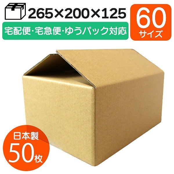 - 【50枚セット】日本製 ダンボール 60サイズ 265×200×125mm 厚さ3mm Bフルート 無地 段ボール 引越し 配送 梱包資材 定形外 宅配便