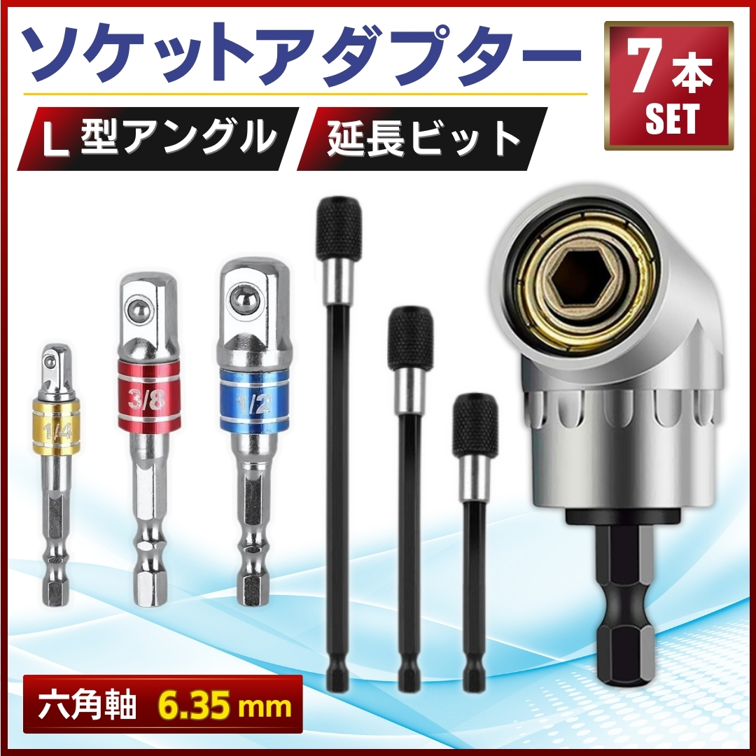> ソケットアダプター セット 7点 L型 アングル アダプター インパクト アタッチメント 六角軸 工具 電動 変換 ドリル 延長 ビット DIY 作業