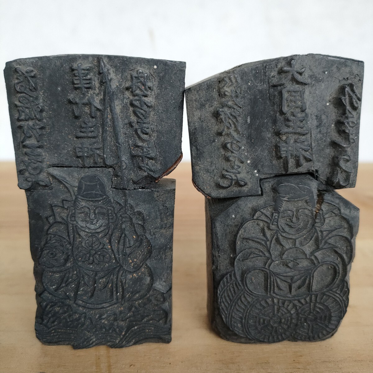 - 蔵出し初出し 版木 事代主神 大国主神 恵比寿天 大黒天 2体セット 9cm×5cm 原版 木版 縁起物 時代 希少民間信仰 工芸品 木工 民藝 古美術