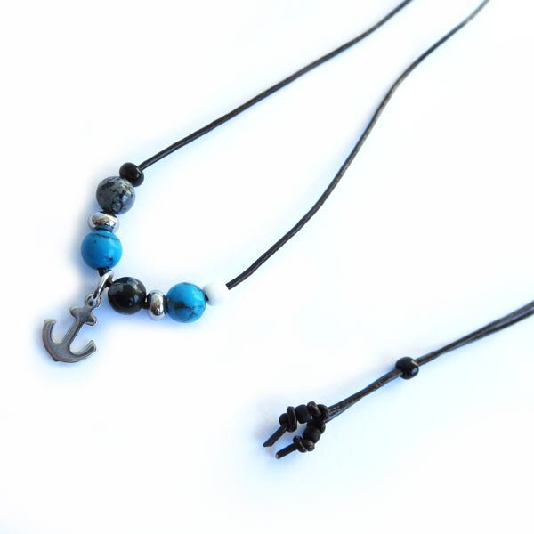 - 革紐細めネックレス チョーカー 染めターコイズ オブシディアンフレーク ミニマリンチャームつき ステンレス金具 BN07
