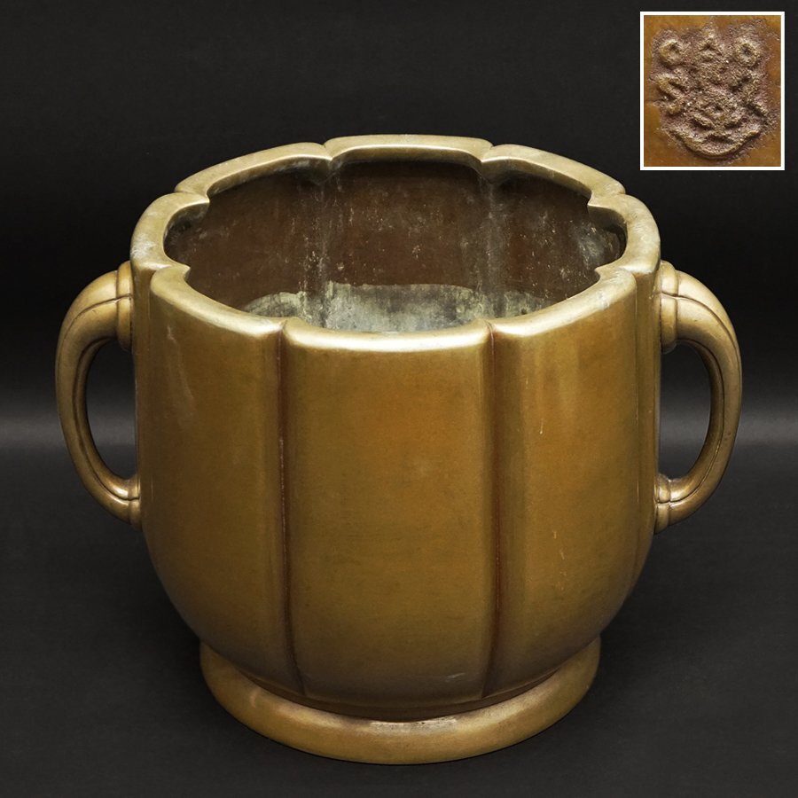 - 楽山造 木瓜形 耳付 宣徳銅火鉢 時代 骨董 古銅 古作 重量8900g 煎茶道具 茶道具 古美術品 No.3