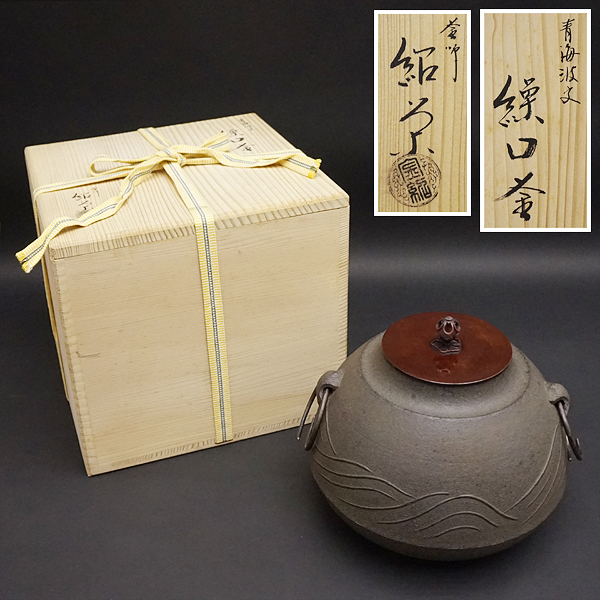 - 鋳師 金森紹栄造 青海波文繰口釜 茶釜 鉄釜 鉄器 鉄製 金属工芸 工芸 共箱 煎茶道具 茶道具 煎茶器 時代 骨董 古美術品