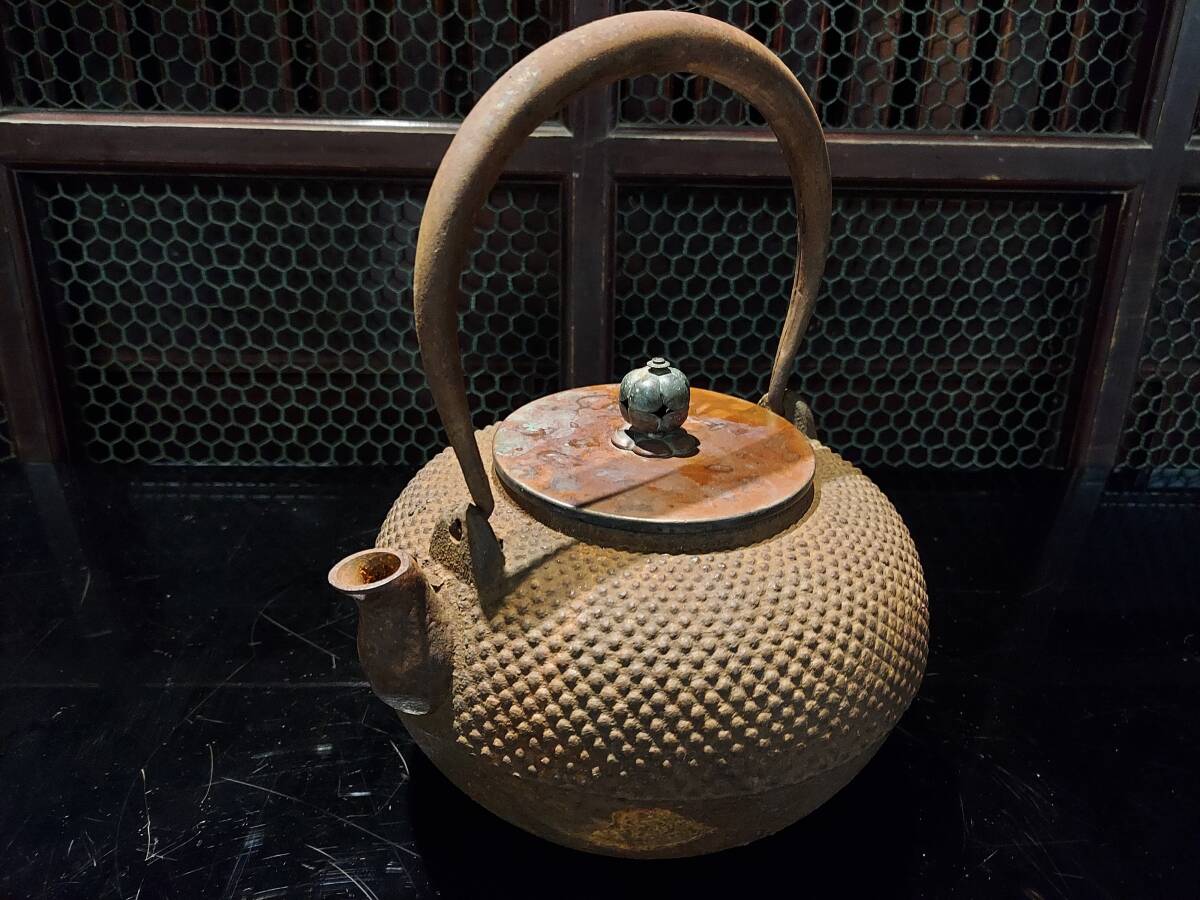 - K02-1009 古鉄瓶 鉄瓶 湯沸 鉄壺 小型 霰文様 唐銅蓋
