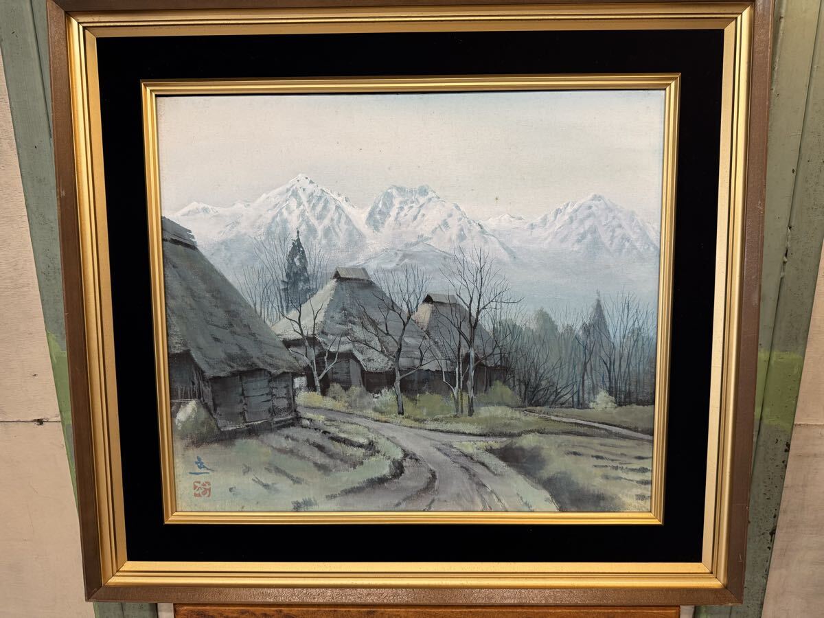 - 【真作】榎本良一 『 安曇野 』 油彩 10号 山里初雪図 茅葺き古民家と雪嶺 風景画 インテリア 油彩画