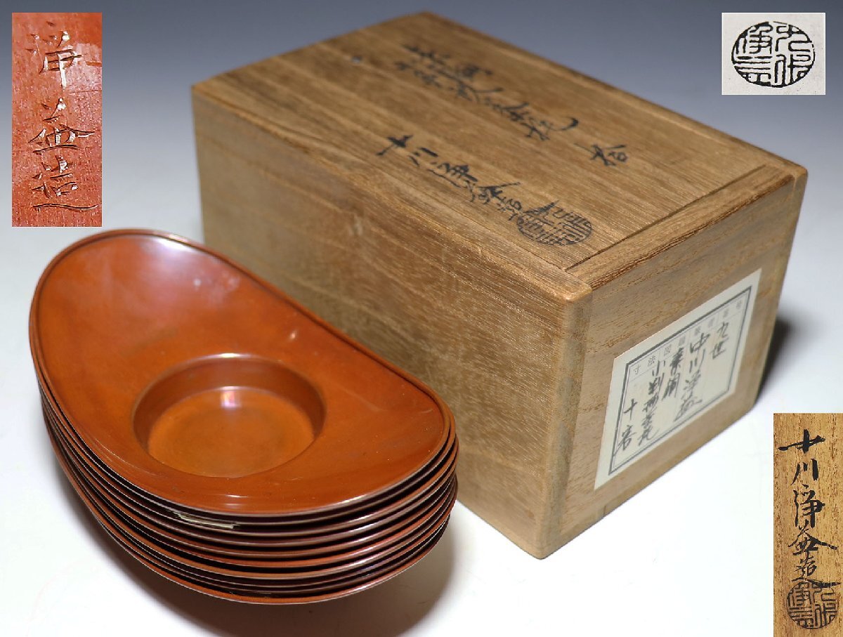 - 【桃】煎茶道具:素銅小判型茶托十客 九世中川浄益造 在銘共箱