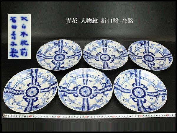 - 【銀閣】青花 人物紋 折口盤 φ21cm 六件 在銘 旧家蔵出 送料無料(F85)