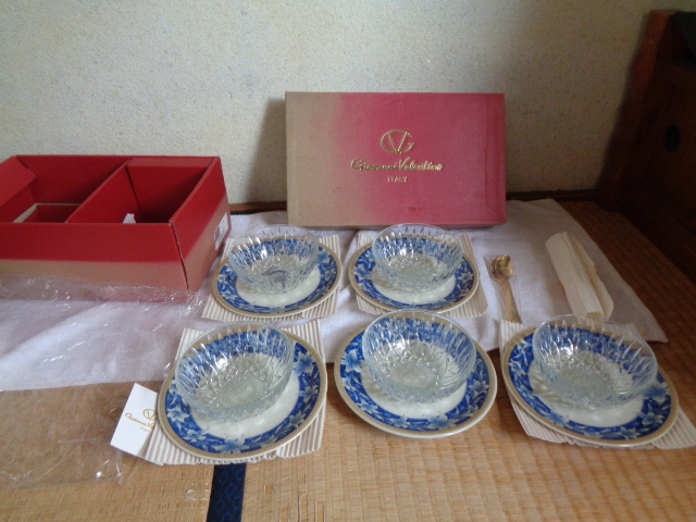 - Giovanni Valentino ITALY/ジョバンニ・バレンチノ/デザートセット:小皿&ガラス小鉢&スプーン 各5個セット/箱入未使用美品-長期保管品