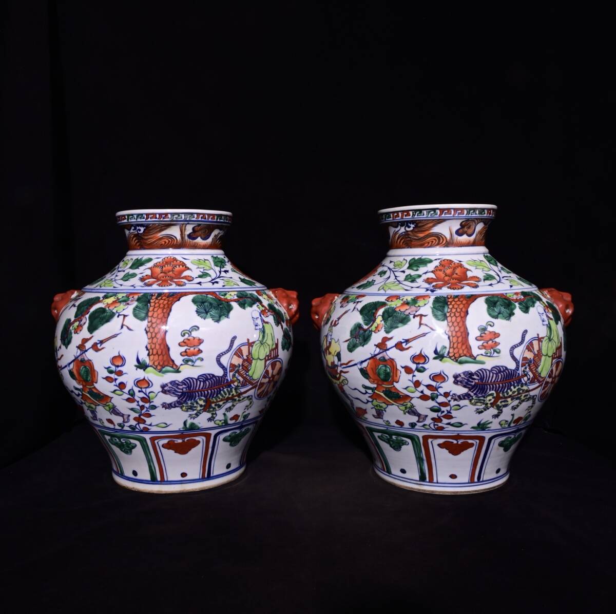 > A_YF0536【惠】人間国宝 中国骨董 陶芸 磁器【元代博陵第張文進款五色鬼谷子下山人物故事紋獣頭缶】工芸品 施釉陶 青花磁 陶芸 置物 收藏品