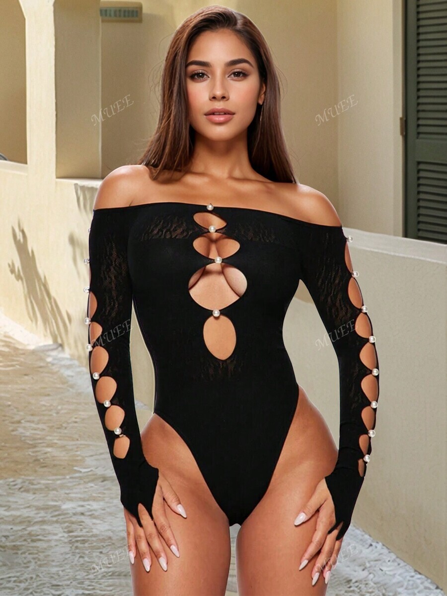 - ボディスーツ レオパード柄オフショルダー ストレッチ ホロウアウト パーティーボディスーツ(レディース)