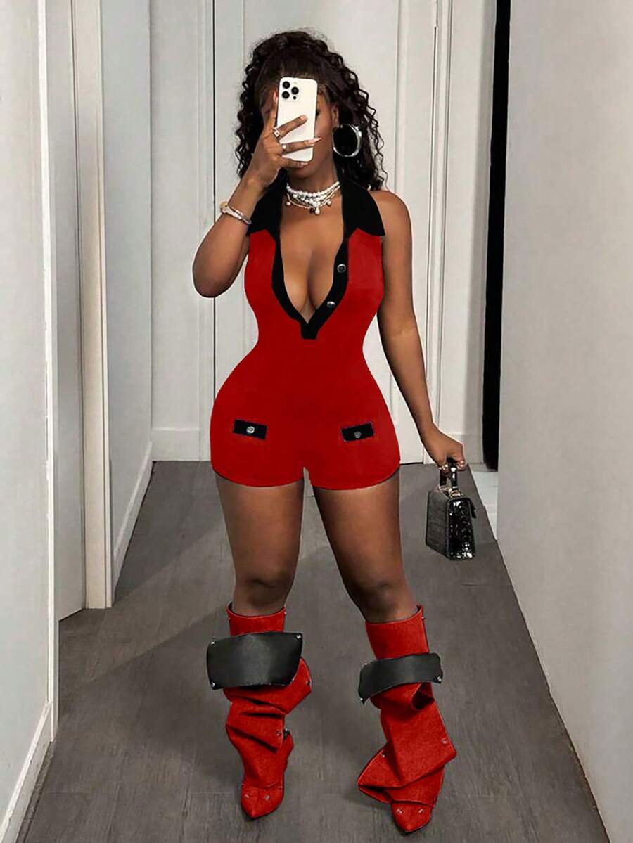 - ボディスーツ レディースコントラストカラー衿ボタン前立て フィッテッド ノースリーブ ジャンプスーツ
