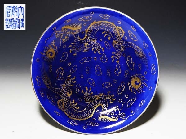- 【桃】清朝期瑠璃金彩双龍図皿 大清乾隆年製
