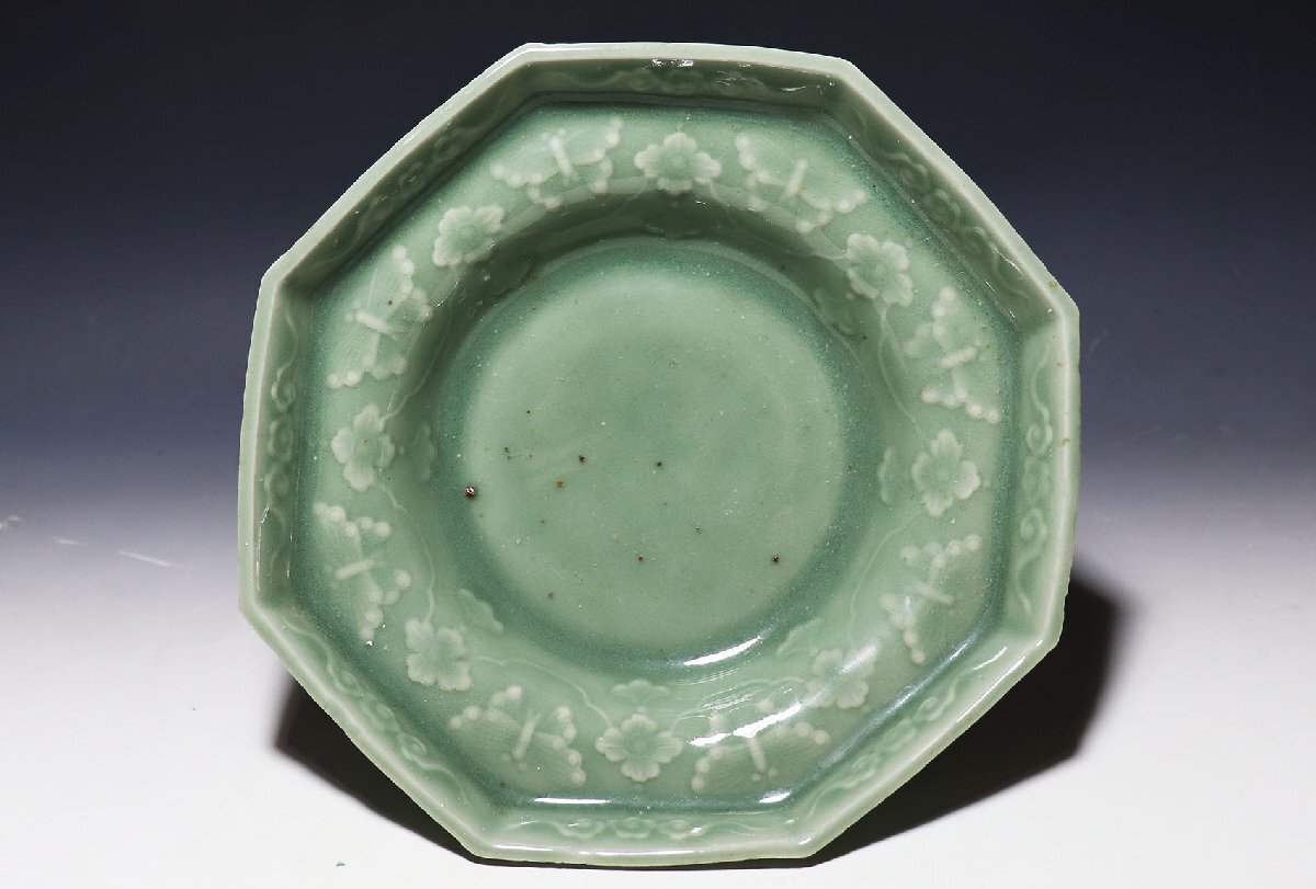 - 【桃】三田青磁陽刻花蝶図八角面取台鉢