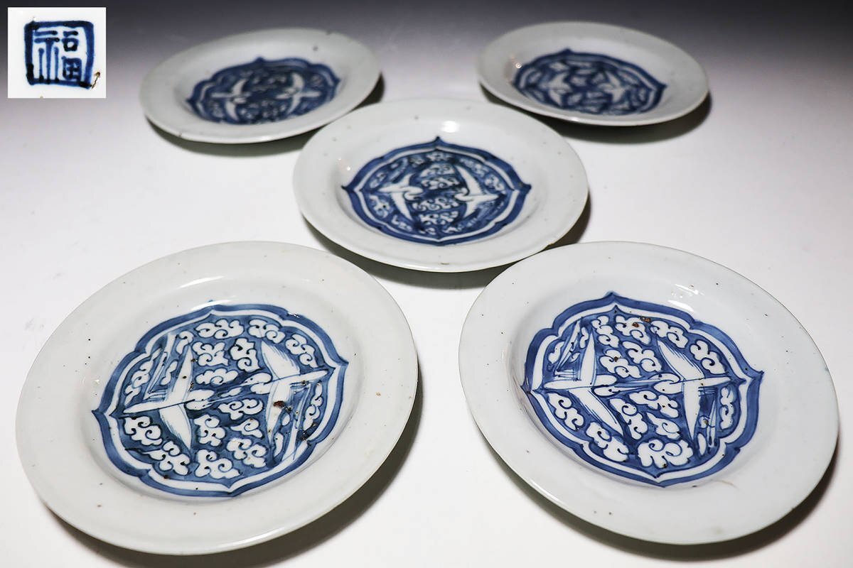 - 【桃】古染付:明末清初染付白抜双鳥図皿 五客