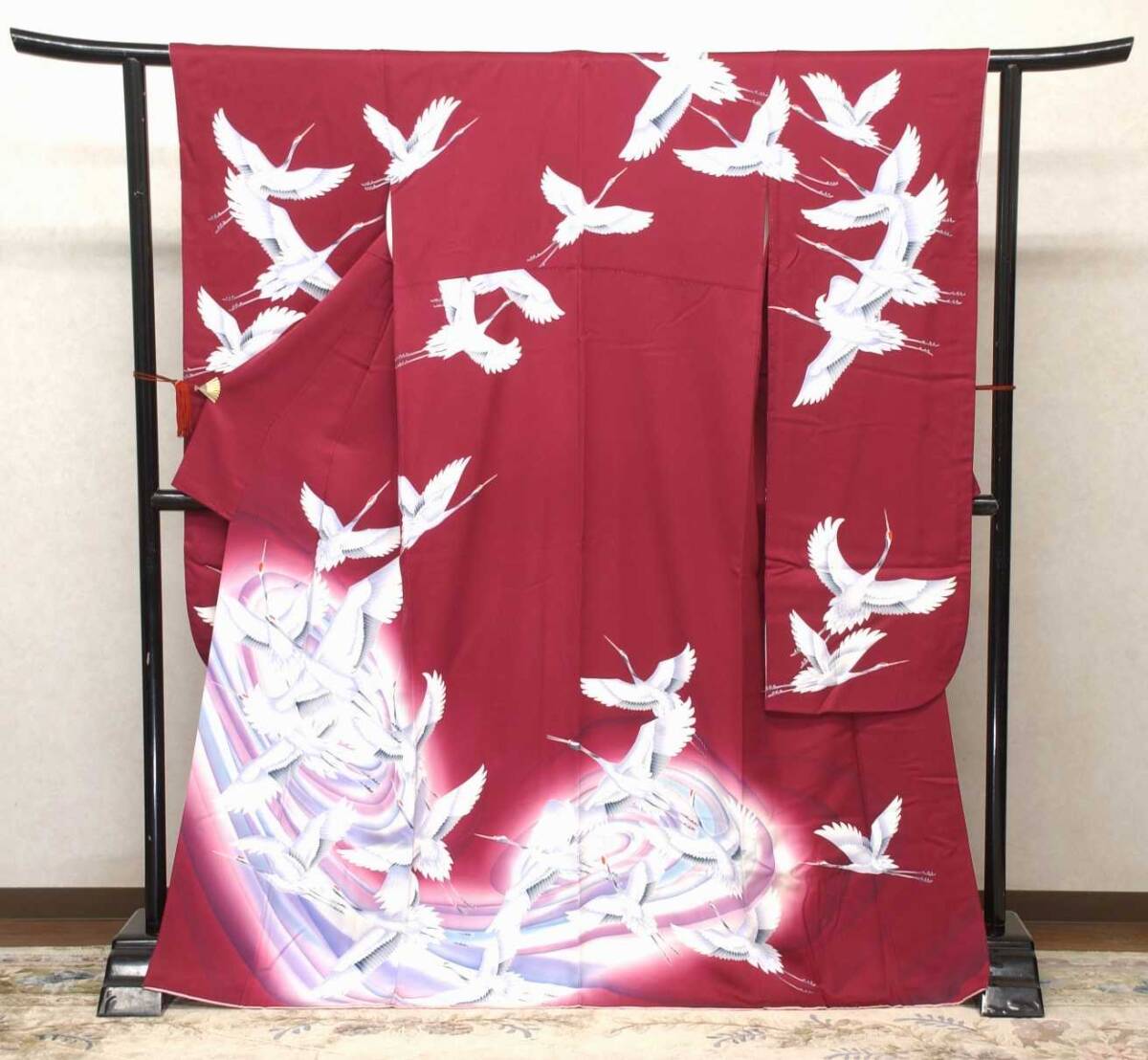 - ☆振袖☆濃い牡丹色 鶴 飛鶴 正絹 裄64.5cm 袖丈106㎝ 伊達衿付☆キレイ☆豪華/逸品