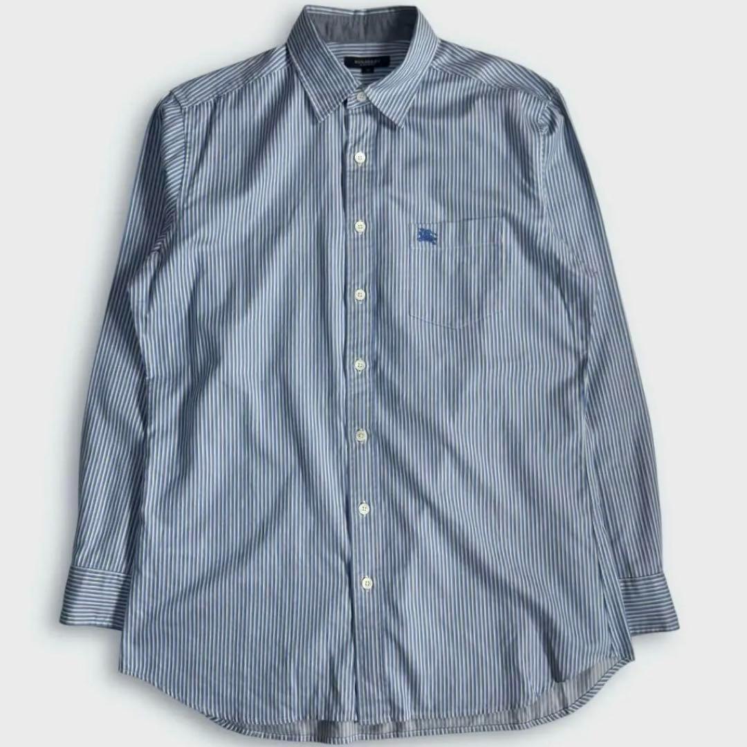 > 美品 バーバリーロンドン 長袖シャツ ストライプ ロゴ刺繍 サックスブルー 春秋 BURBERRY LONDON メンズ カジュアル
