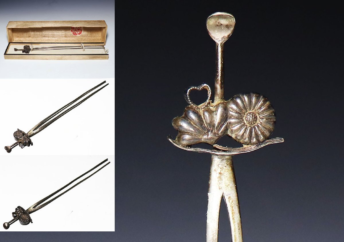 - 【桃】アンティーク髪飾り:金工銀製菊花簪