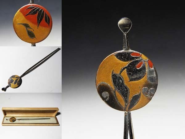 - 【桃】アンティーク髪飾り:金工銀地蒔絵青貝螺鈿花紋様図簪