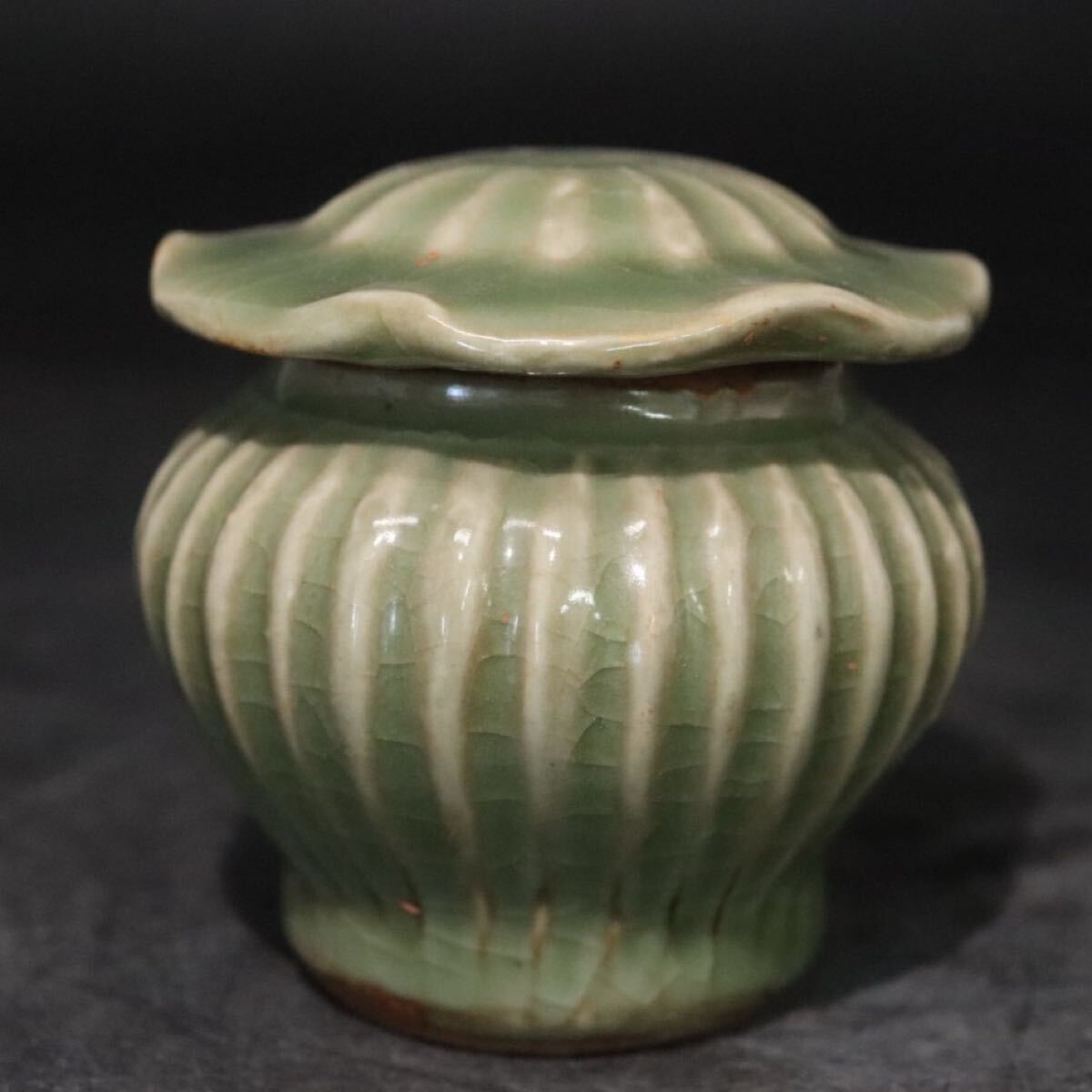 - 時代 青磁 陽刻 櫛文 沈香壺 ( 蓋付 小壺) / 中国美術 秘色 検索: 越州窯 龍泉窯 天龍寺 七官青磁 .B1223
