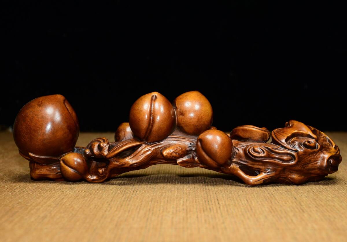 - 『館蔵珍品 黄楊木製 細密彫 靈芝壽桃 如意筆架 置物 賞物』稀少珍蔵品 古賞物 貴重物品 収蔵品 中国古美術 時代物 古董品