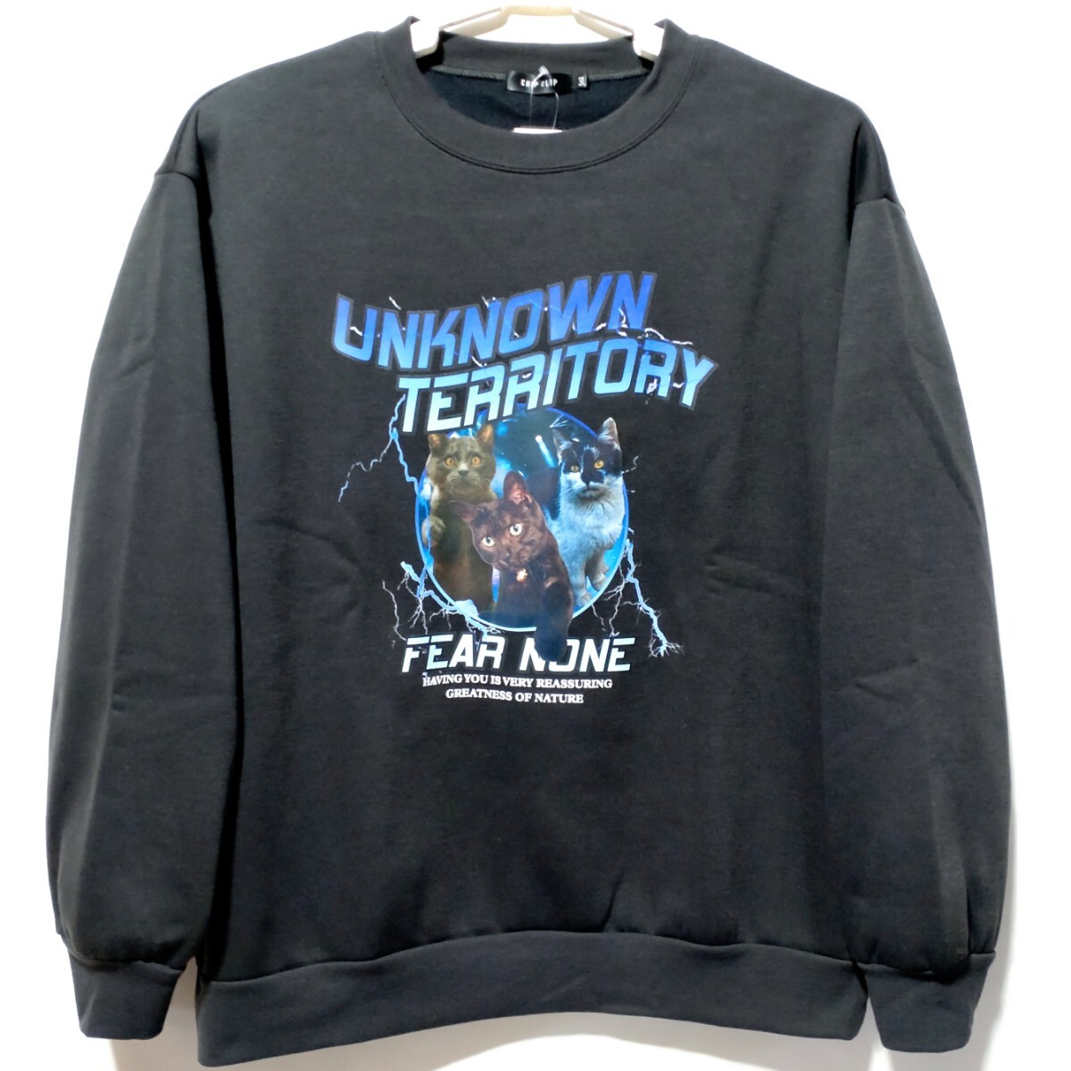 > 特価/未使用【サイズ=3L(2XL)】ノーブランド/猫プリント/メンズ/裏起毛/スウェット/トレーナー/胸囲=106~114cm/black(墨黒)
