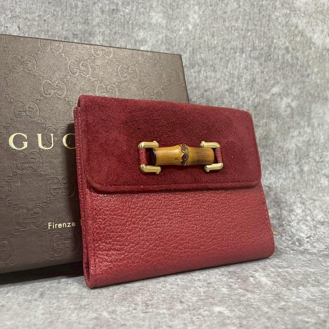 - 美品 GUCCI グッチ 二つ折り財布 バンブー レザー スエード レッド