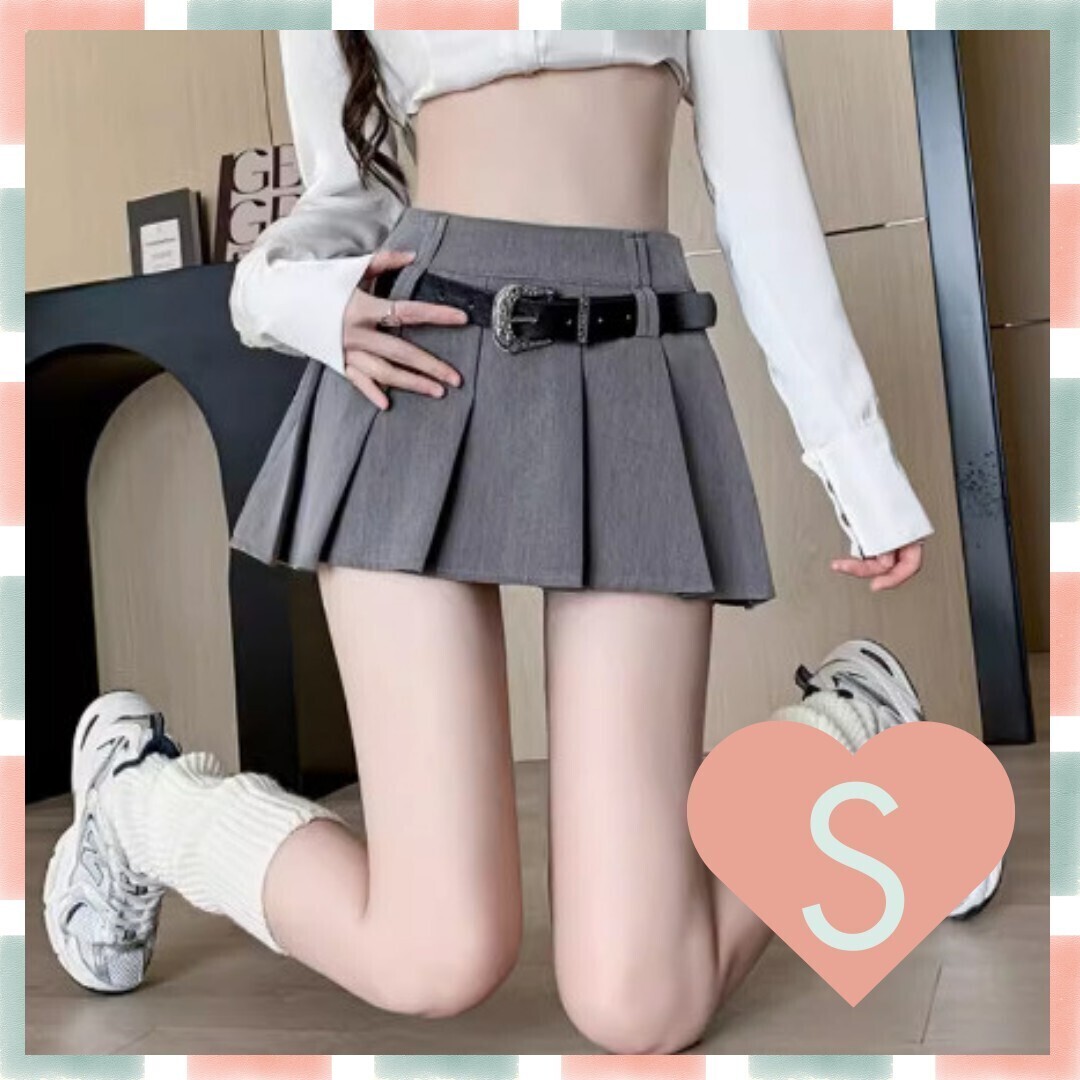 - プリーツスカート ミニスカート レディース グレー ベルト付き 韓国 S 脚長 可愛い 無地 ハイウエスト セクシー グレー