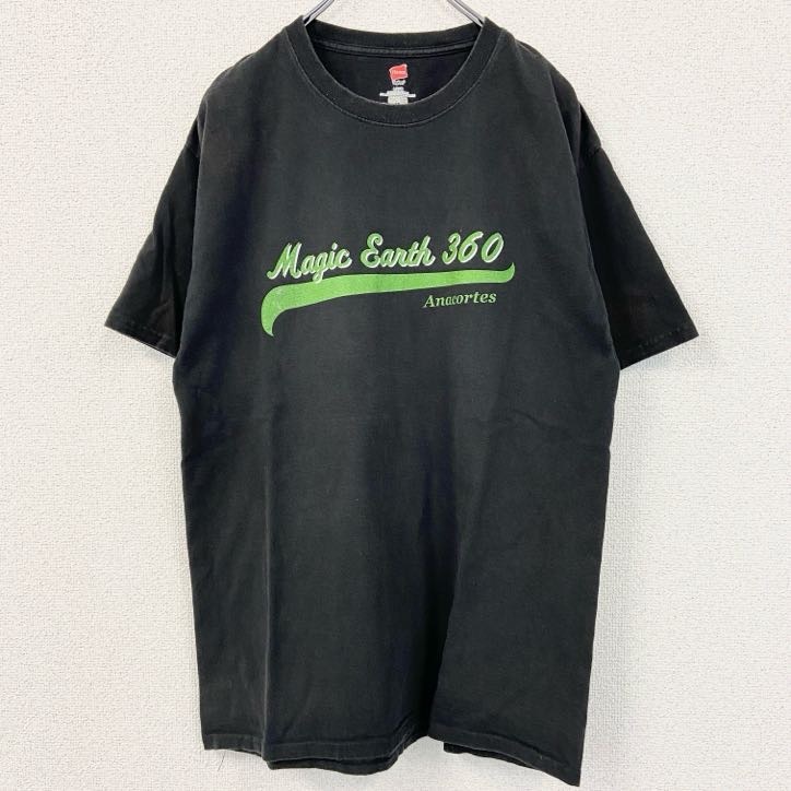 > 古着 used Hanes ヘインズ 半袖プリントTシャツ MUSIC EARTH 360 ロゴ 黒 ブラック Lサイズ