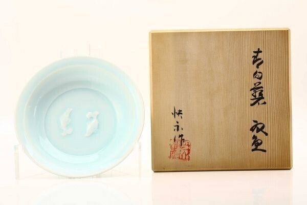 - U50118 人間国宝 塚本快示 本人作 青白磁 双魚 鉢 共箱 /UZ