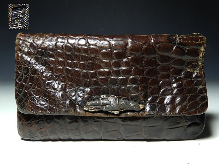 - 【桃】提げ物:金工鉄金象嵌地刀図飾り金具革製煙草入れ