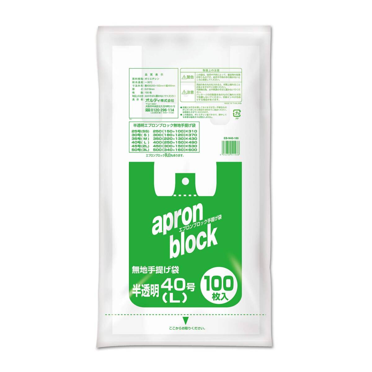 - オルディ レジ袋 40号 L 半透明 100枚入 コンビニ袋 テイクアウト 取っ手付き ポリ袋 手提げ袋 エプロンブロック EB-N40-100