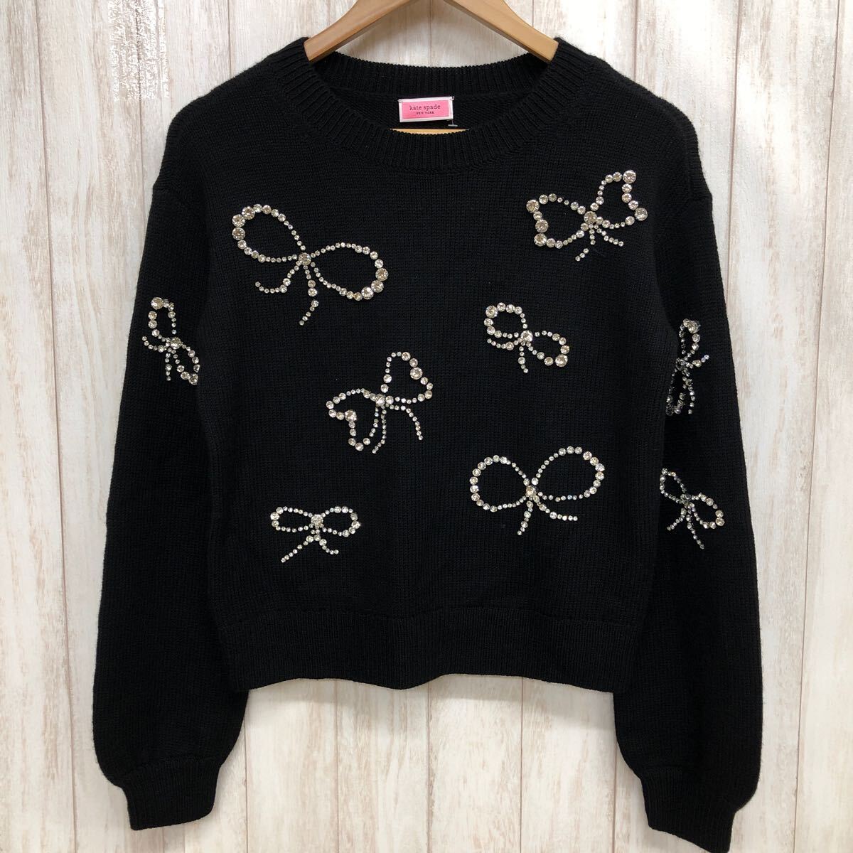 > kate spade new york ケイトスペード 長袖ニット Sサイズ セーター ビジュー ラインストーン リボン ウール 黒 レディース YF588