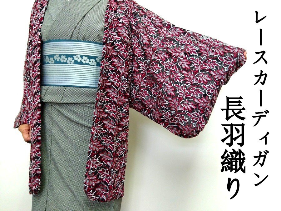 - レースカーディガン 長羽織 総レース レースコート 和洋兼用 単衣 仕立上り 葉模様刺繍 赤 グレー 黒 827 ggp