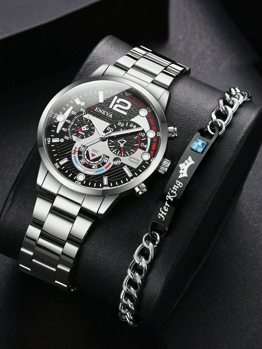 - 腕時計 メンズ セット メンズ 鋼製バンド ファッションビジネス カレンダー クォーツ腕時計 + ブレスレット 2点セット