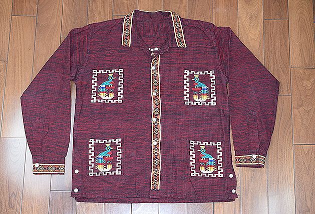 > 希少 Lサイズ 1970’s ビンテージ オープンカラー 刺繍 ガテマラ グアテマラ 長袖 シャツ VINTAGE ボックスシャツ エンジ色 60s 80s 南米