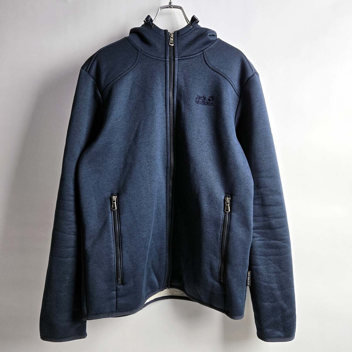 - フリースジャケット ジャックウルフスキン JackWolfskin STORMLOCK ロゴ刺繍 ジップアップ フード付き 裏ボア L ネイビー アウトドアウェア