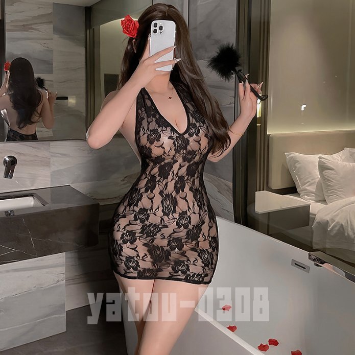 - K166B コスプレウェア シースルー 花柄レース ホルターネック ワンピース ベビードール セクシーランジェリー ナイトウェア