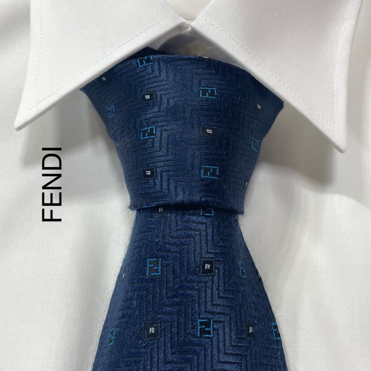 - FENDI フェンディ ズッカ ストライプ ジャガード シルク ネクタイ イタリア製 ネイビー TG2990