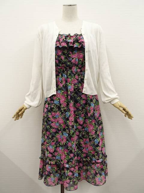 - 美品 CECIL McBEE等 長袖カーディガン+ロング丈キャミワンピ コーデ2点セット M相当 白/黒地 チェック&ピンク×青 花 カジュアル系 20代