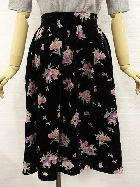- 美品 レッセパッセ LAISSE PASSE ひざ丈 ベロアギャザーフレアスカート 36 ブラック地 ピンク×パープル 花柄