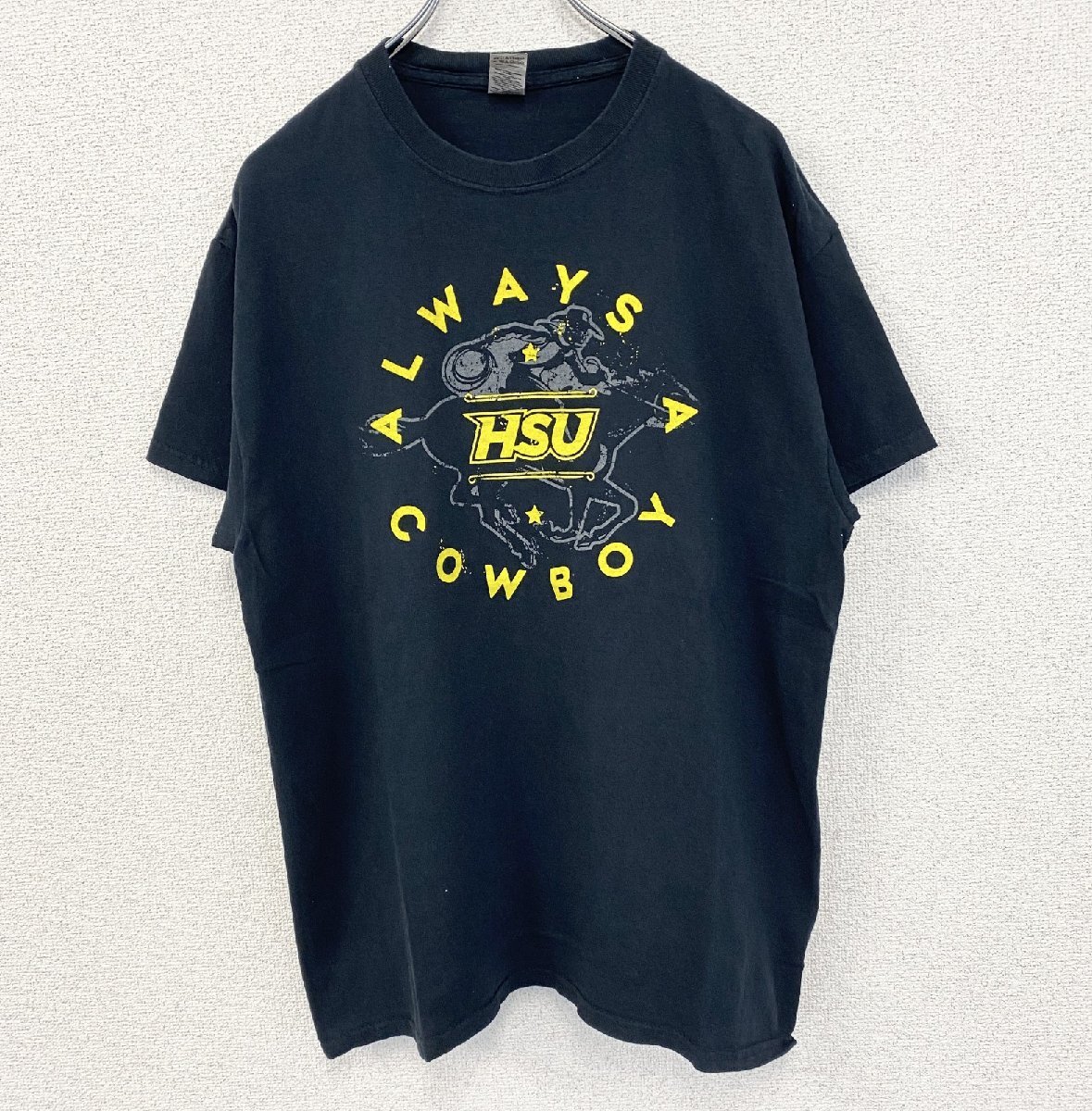 - 古着 used GILDAN ギルダン 半袖プリントTシャツ カウボーイ 馬 クルーネック 春夏服 レトロ 黒 ブラック Lサイズ