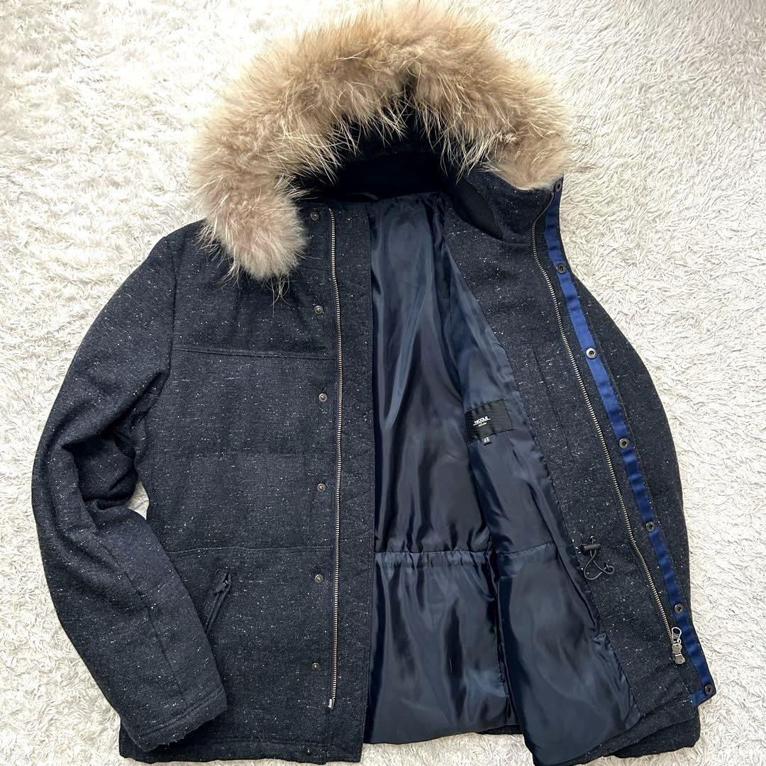 > NICOLE ★希少 Lサイズ★ ネップツイード ダウンジャケット ニコル ラクーンファー フード 取り外し可 ダブルジップ 灰色 グレー 48 メンズ