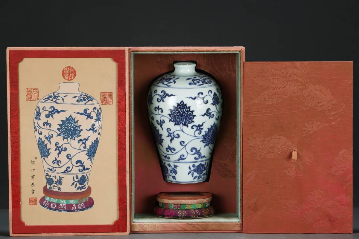 - yfa|0737 中国磁器 陶芸 磁器『明代の青花纏枝蓮紋の梅瓶です』施釉陶 古代工芸品 陶芸 精美彫 置物 收藏品