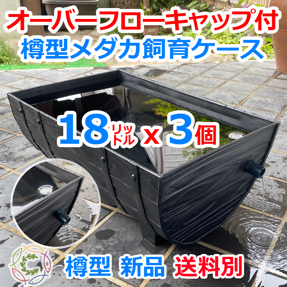 - 【新仕様】メダカ飼育ケース 樽型18㍑黒x3個 オーバーフロー対策済キャップ付 メダカ飼育容器 金魚 ビオトープ 睡蓮 水草 五色アクア