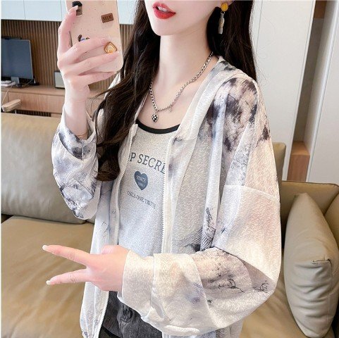- トップス アウター 羽織 長袖 薄手 フード付き カジュアル 透け感 かわいい 日よけ 紫外線対策 冷房対策 レディース M グレー