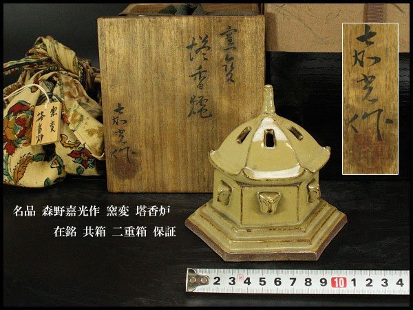 > 【銀閣】名品 森野嘉光作 窯変 塔香炉 在銘 共箱 二重箱 保証 旧家蔵出 送料無料(ZE30)