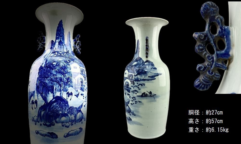 - SR1684青花染付大花瓶 透し双耳 山水楼閣風景人物図染付絵 大振り 高57㎝ 重6.15㎏ 中国時代美術焼物
