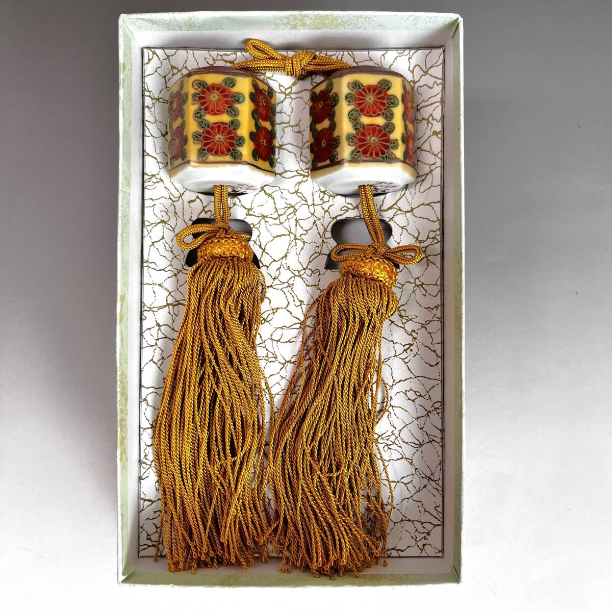 - 新品◆九谷焼【陶秀 赤手菊詰 風鎮】陶器 茶道具 床の間 掛け軸 飾り 錘