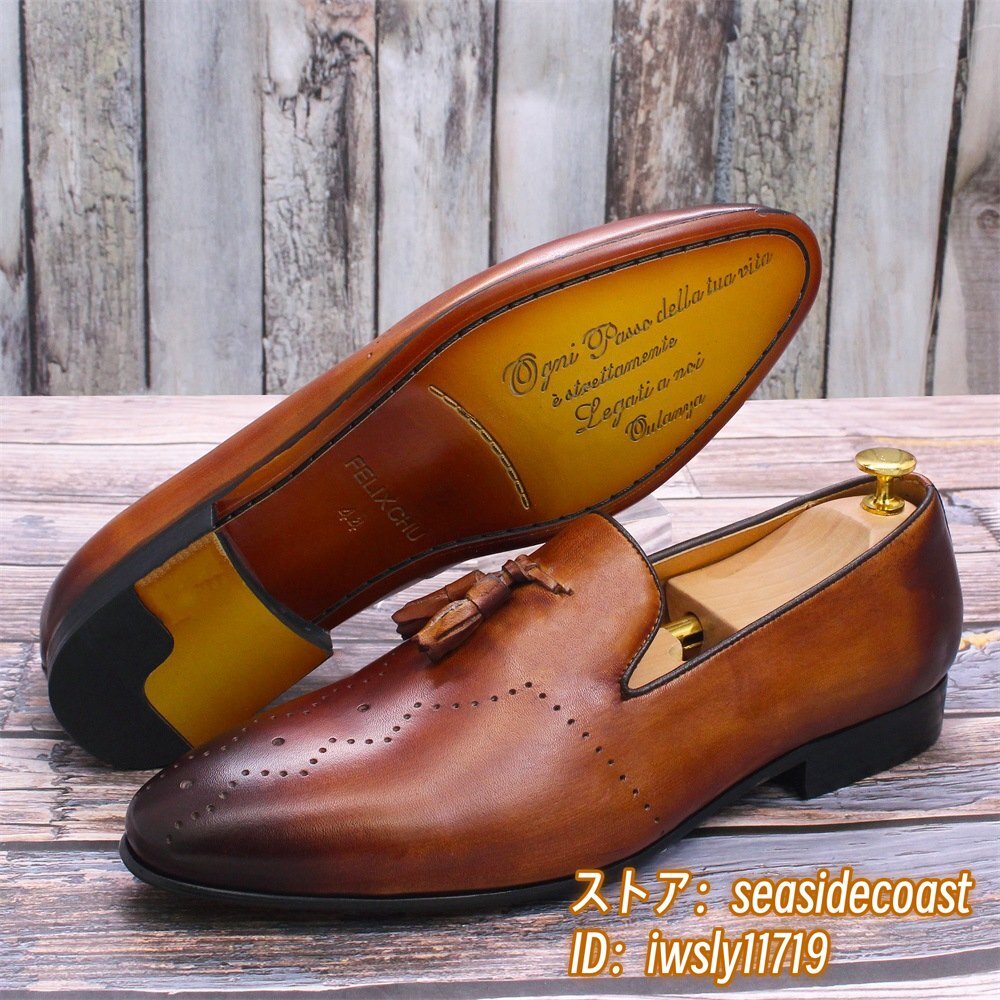 > 最高級★定価11万 本革 ローファー メンズ 職人手作り 彫り ビジネスシューズ レザーシューズ スリッポン 紳士靴 牛革革靴 ブラウン 26.0cm