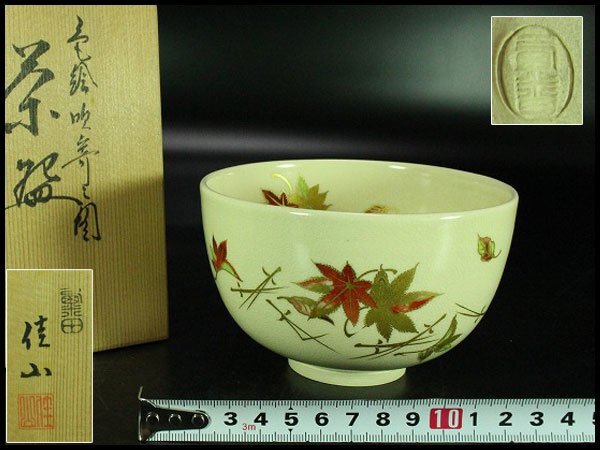 > 【金閣】茶道具 岡田佳山造 紅葉 栗田焼 色絵 茶碗 共箱 和食器 旧家蔵出 送料無料(YC496)