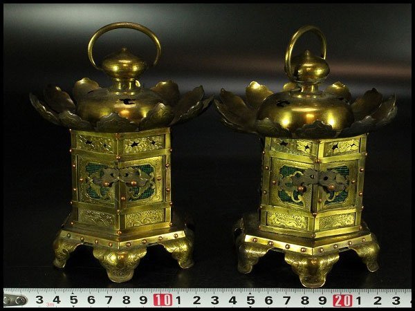 - 【金閣】仏教美術 鍍金 銅製 吊り灯籠 一対 美品 旧家蔵出 送料無料(A390)